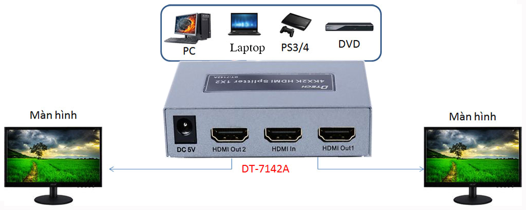 Sơ đồ kết nối bộ chia HDMI 1 ra 2 DTECH DT-7142A
