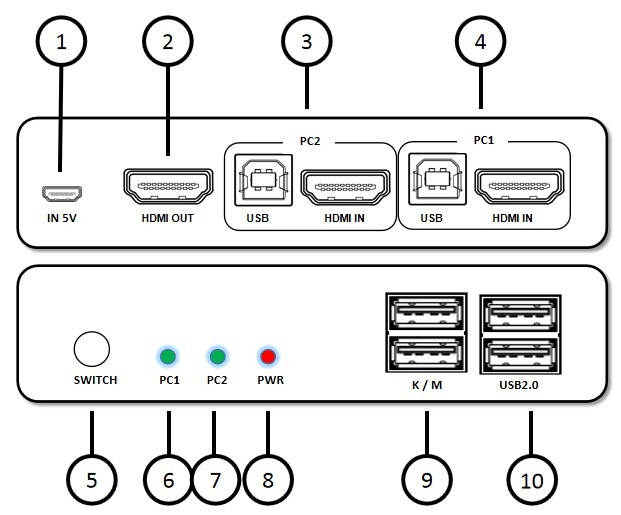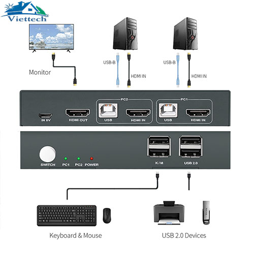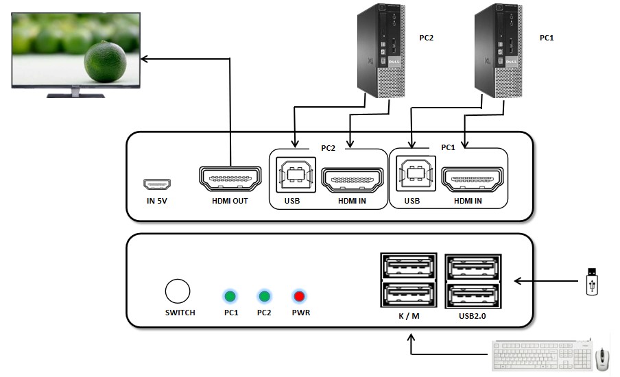 . Sử dụng cáp HDMI và cáp USB A-B để kết nối với HDMI IN và USB của PC1 và PC2;