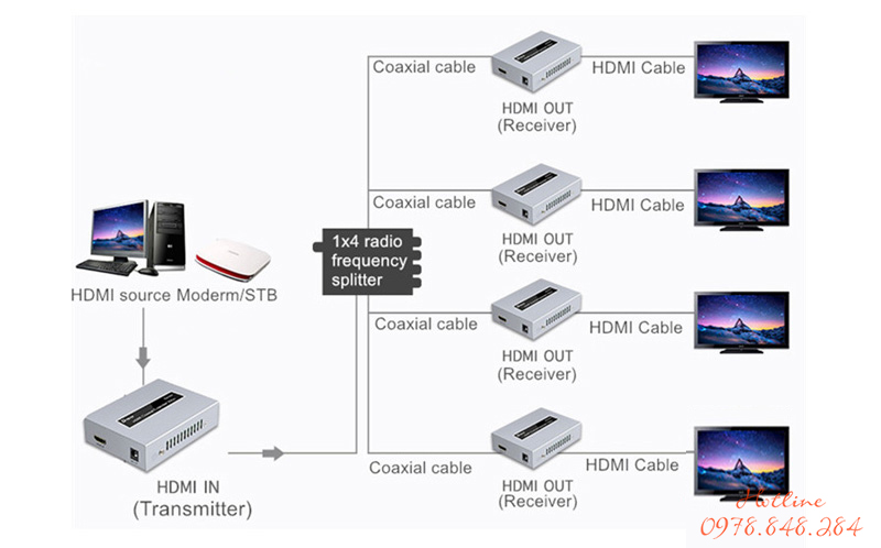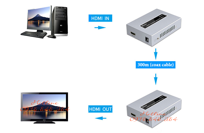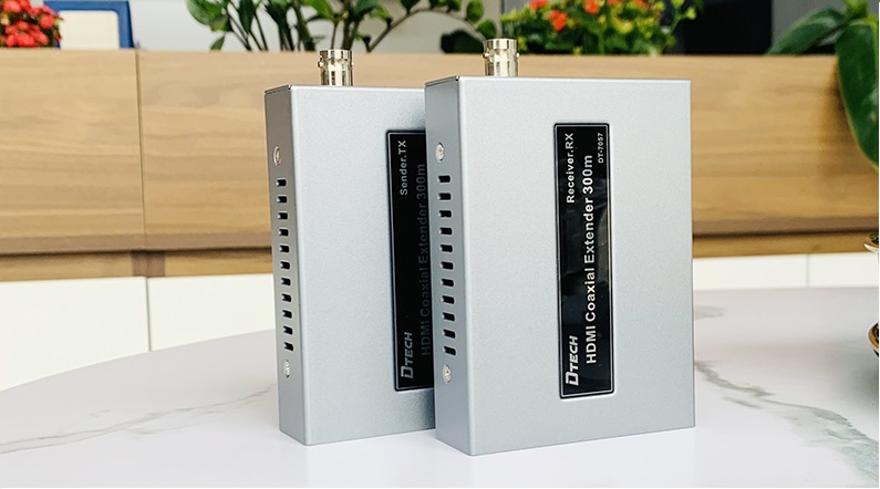 Bộ kéo dài HDMI DT-7057 qua cáp đồng trục 300m: có khả năng chuyển đổi tín hiệu HDMI sang tín hiệu tần số vô tuyến để truyền qua cáp đồng trục với khoảng cách tối đa 300m.
