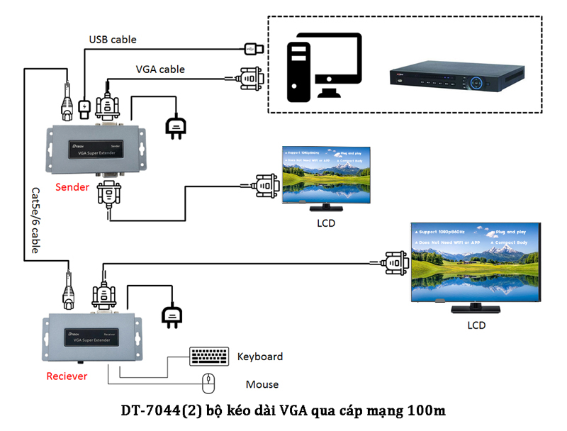 Hình ảnh sơ đồ kết nối chi tiết bộ kéo dài VGA qua dây mạng DT-7044(2)