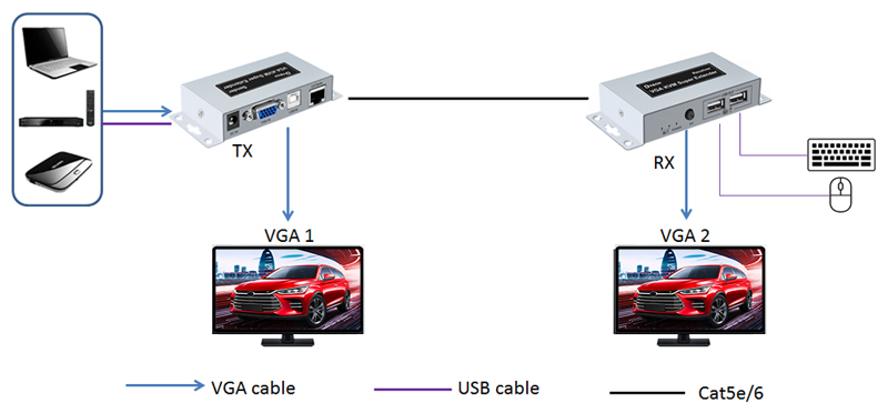 - Thiết bị truyền Sender bao gồm 1 cổng VGA in, 1 cổng VGA out, 1 cổng mạng CAT5e/6e, 1 cổng USB in