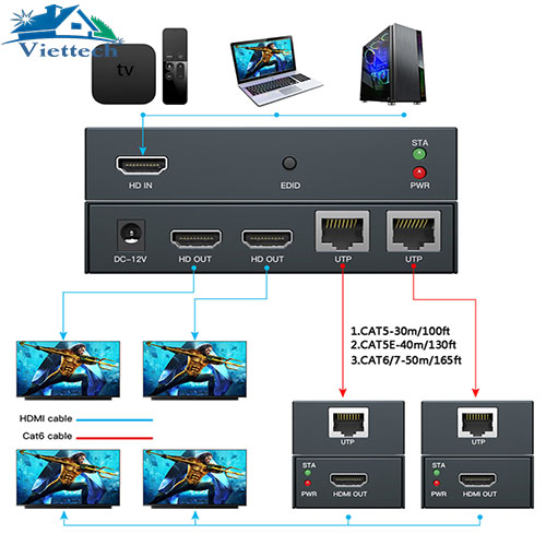 - Chuyển đổi đầu vào kênh HDMI thành tín hiệu 2 kênh đầu ra Cat6 và 2 kênh lặp;