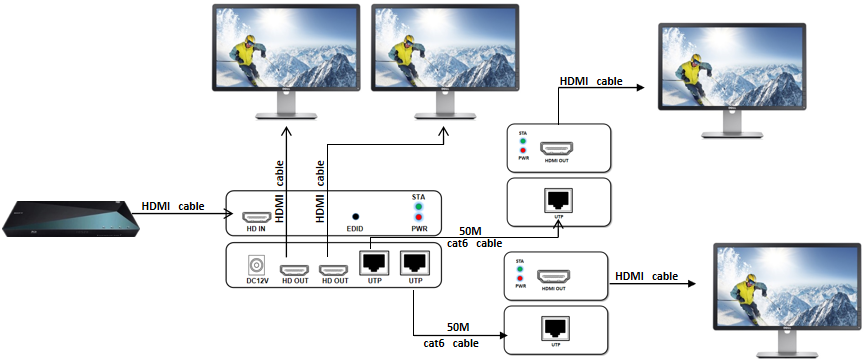 - Truyền 1 tín hiệu âm thanh và video HDMI lên đến 50M qua một cáp CAT6;