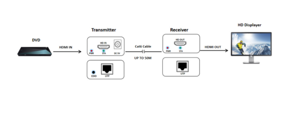 - Truyền tín hiệu âm thanh và video HDMI lên đến 50M qua một cáp CAT6 duy nhất