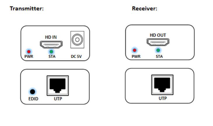 - Các tác dụng của nút EDID, chẳng hạn như kết nối sau khi khởi chạy PWR, đèn báo STA, PWR dài ở đầu nhận, đèn báo STA, hiển thị lâu không có hình ảnh hoặc màu sắc, nguồn phát trên màn hình của cổng HDMI và kết nối cổng HDMI, nhấn và giữ EDID
