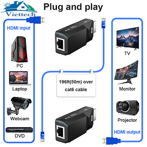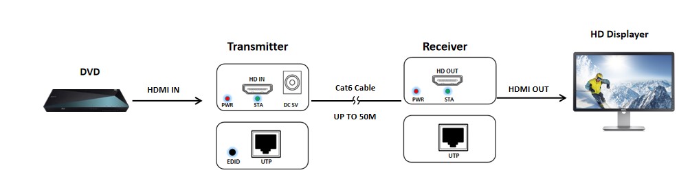 - Truyền tín hiệu âm thanh và video HDMI lên đến 50m qua một cáp đơn CAT6.