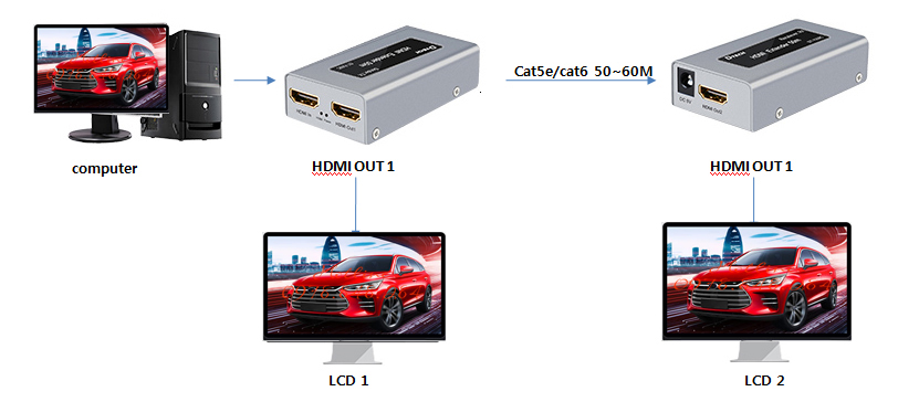 Bộ Extender HDMI 60M kết nối khoảng cách 60M qua cáp mạng chuẩn Cat5e/Cat6, Chuẩn hình ảnh không nén được ứng dụng cho truyền tín hiệu hình ảnh rõ nét nhất với sơ đồ kết nối đơn giản.