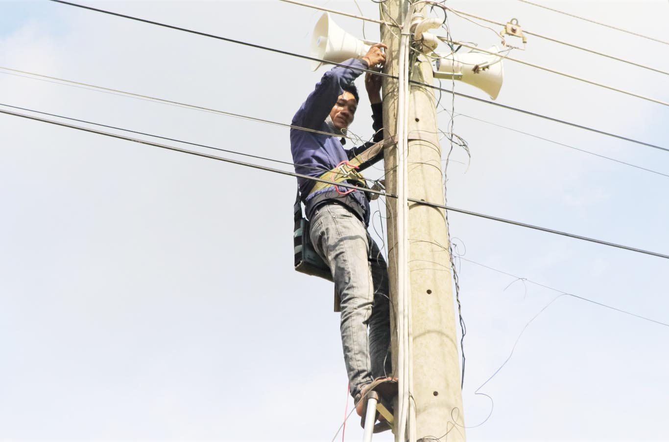 Thi công lắp đặt loa truyền thanh thông minh trên địa bàn huyện Bù Đốp. Ảnh: Hùng Vương.